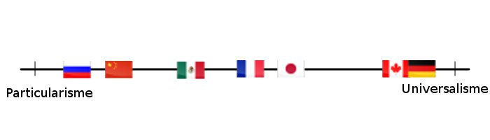 En Europe, la France est réputée pour être plus particulariste et plus relationnelle que ses voisins. Les pays anglo-saxons sont plus généralement à l’extrémité universaliste de l’axe et les pays asiatiques, latins et africain tendent vers le particularisme. La Russie est un pays où il vaut mieux connaître les bonnes personnes pour obtenir ce que l’on désire.